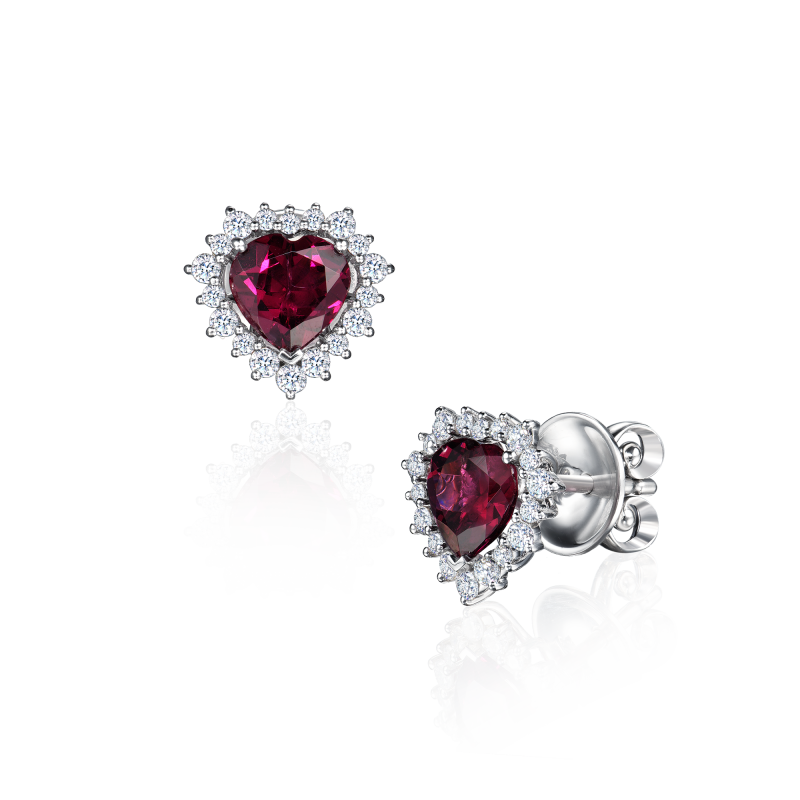 Rhodolites cut the heart. Round cut diamonds.