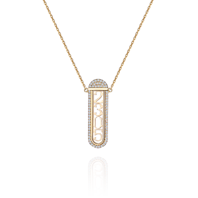 The capsule is made of yellow gold and sapphire glass, decorated with a scattering of shining diamonds, fixed on a chain with three levels of length. You can put 4 gold interchangeable digits in the capsule at the same time, which symbolize something important for you – dates or events of special significance or sacred meaning.