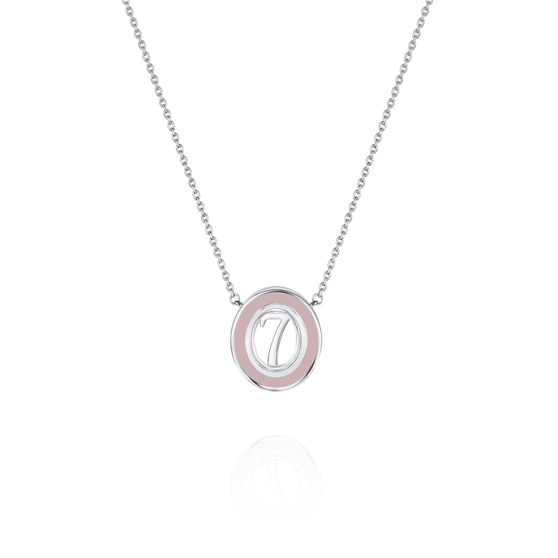 The conceptual pendant on a chain with three levels of length is made of white gold. In the center of the pendant, under a sapphire crystal with a rim of colored enamel, there is a gold numeral. The meaning and meaning of the number may not be available to outsiders, but it is extremely important to you.