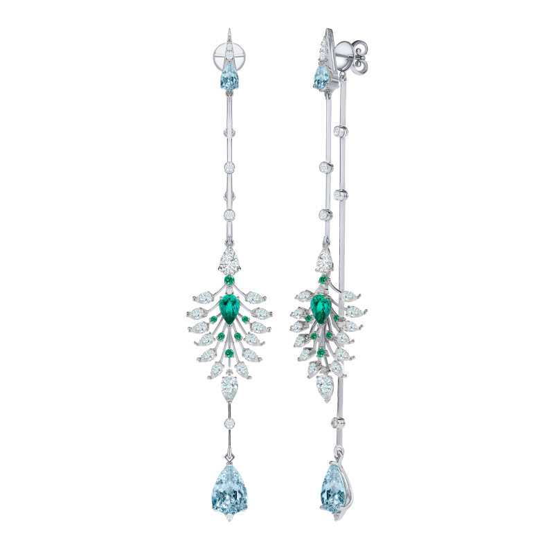 Pear-cut and round-cut emeralds. Pear-cut aquamarines. Pear-cut and round-cut diamonds.