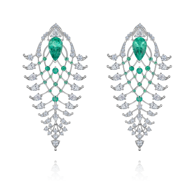 Pear-cut and round-cut emeralds. Pear-cut, trillion-cut and round-cut diamonds.