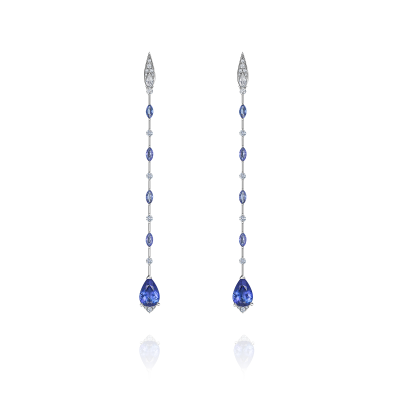 Tanzanites pear-cut and marquis-cut. Pear-cut and round-cut diamonds.