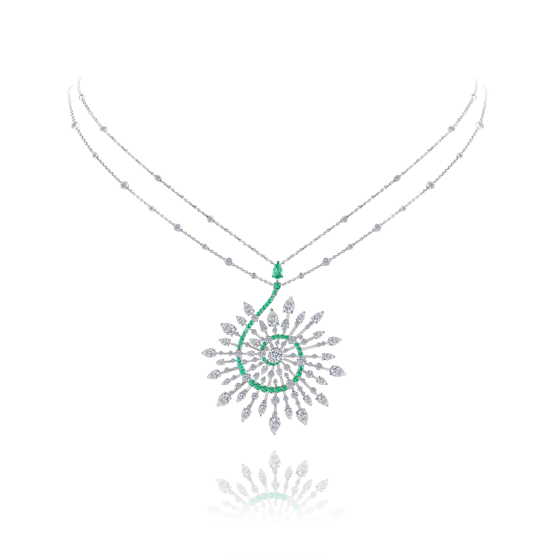 Pear-cut and round-cut emeralds. Pear-cut and round-cut diamonds.