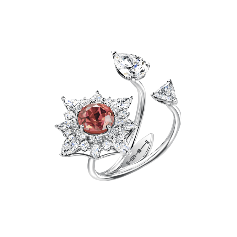Round-cut tourmaline. Pear-cut, trillion-cut and round-cut diamonds.