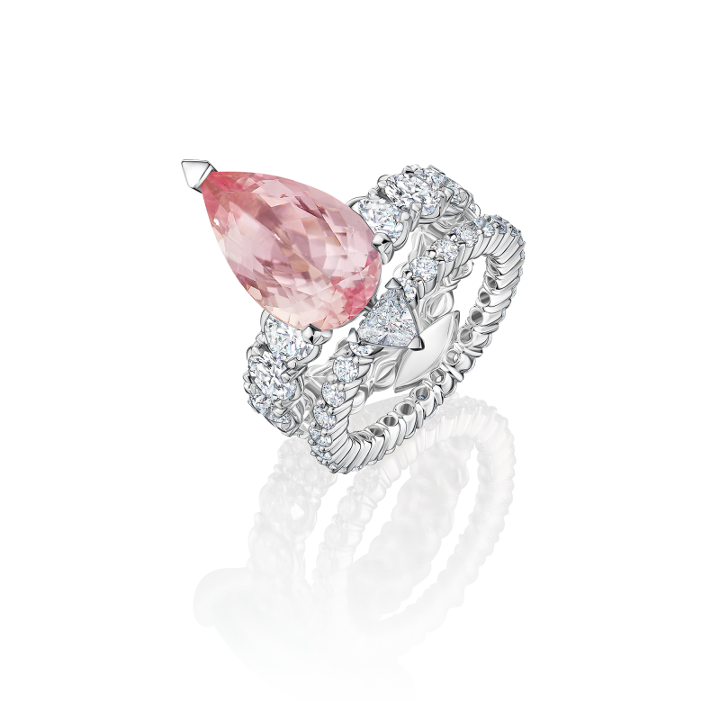 Pear-cut morganite. Trillion-cut and round-cut diamonds.