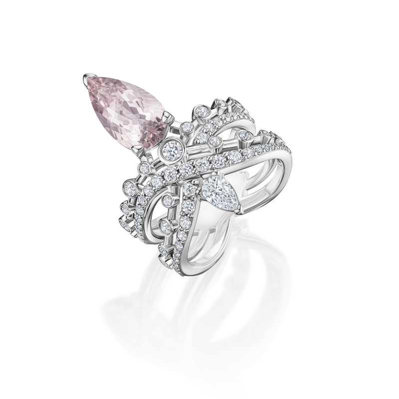 Pear-cut morganite. Pear-cut and round-cut diamonds.