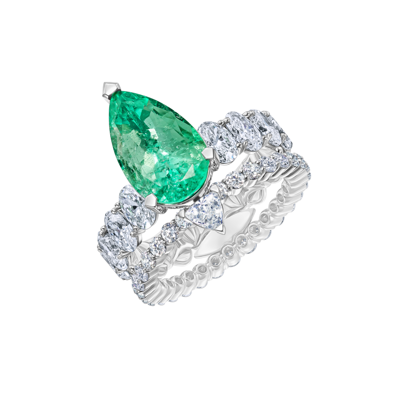 Pear-cut emeralds. Pear and oval cut diamonds.