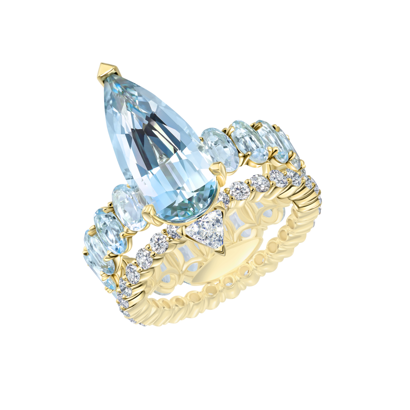 Pear and oval cut aquamarines. Trillion-cut and round-cut diamonds.
