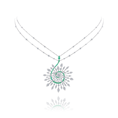Pear-cut and round-cut emeralds. Pear-cut and round-cut diamonds.